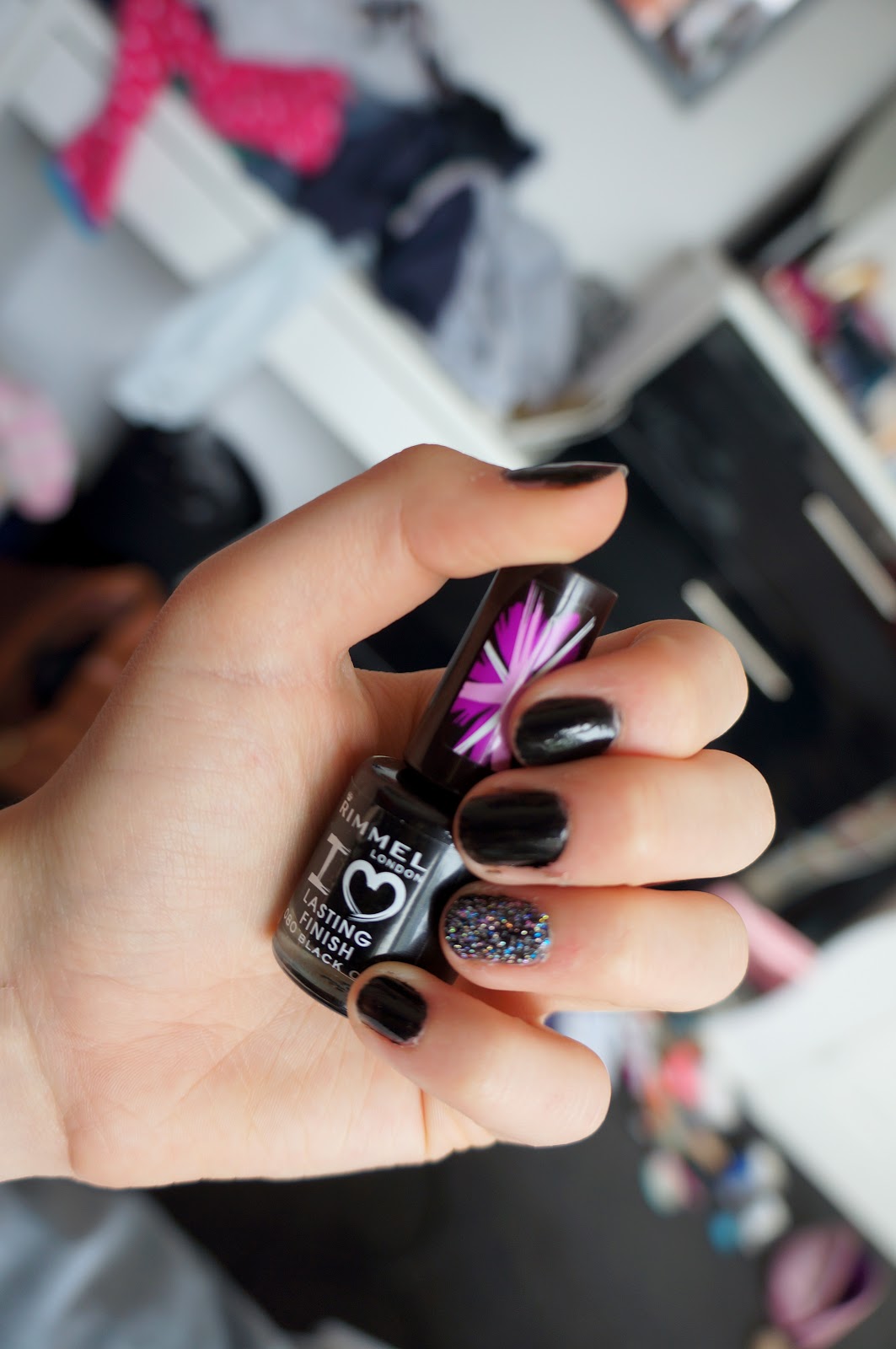 I haven't done a Nail post in a while so I thought seeing as its half term and I can actually paint my nails I would! I quite often go with Rimmel as it's fairly cheap and has a range of colours, usually I think it stays on quite well but after one day my nails painted black became chipped and I had to paint them again, it was quite disappointing! I also decided to go with black nail varnish for the first time just because I have seen lots of photo's and celebrities with black nail varnish on and I always think it looks quite classy. So I thought I would give it a go, especially with Halloween coming up! I always love doing something fancy on top of the plain colour so thought I would dazzle it up with sparkly nail varnish on one finger.